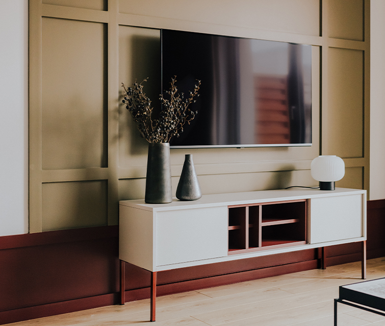 Sercem mieszkania jest kuchnia, która została zaprojektowana w stonowanych beżach z dodatkiem drewna, które są tłem dla stalowych bordowych dodatków. Pokaźnych rozmiarów wyspa została optycznie odciążona dzięki stalowym nóżkom i wieńczącym go regale. Dalsza cześć mieszkania to otwarty salon, gdzie ściana TV została wykończona nowoczesną sztukaterią pomalowaną na kolor butelkowej zieleni, a malowana boazeria w kolorze bordo ciągnie się na wzdłuż całej ściany. Szafka RTV, tak jak pozostałe zabudowy czy meble zostały indywidualnie zaprojektowane z myślą o tym mieszkaniu. Nad tapicerowaną w kolorze szarości sofą znajdują się drewniane półki. Zwiń