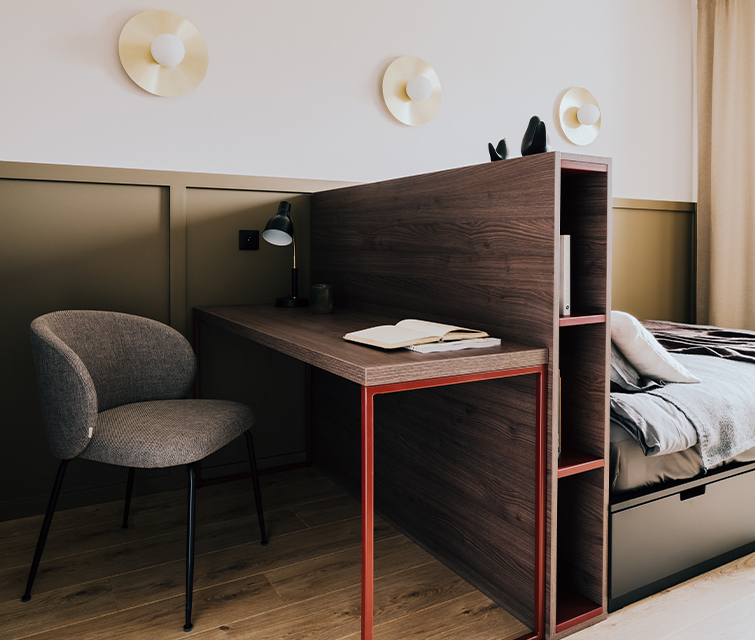 Z salonu możemy bezpośrednio wejść do sypialni, na której ścianach również dominują zielenie, a nieco bardziej dekoracyjnego charakteru dodają trzy kinkiety na mosiężnych talerzach. W niewielkiej sypialni znalazło się również miejsce do pracy, tak ważne we współczesnej erze pracy zdalnej. W mieszkaniu została wydzielona również zamknięta garderoba, co pozwoliło na zrezygnowania z dużych szaf w sypialni i zastąpienie ich jedynie wiszącymi szafkami, które nie przytłoczyły wnętrza.