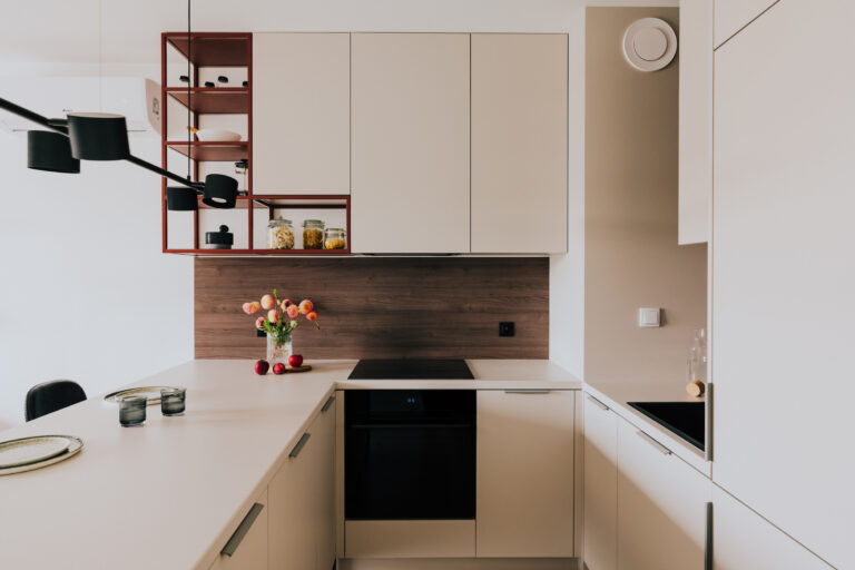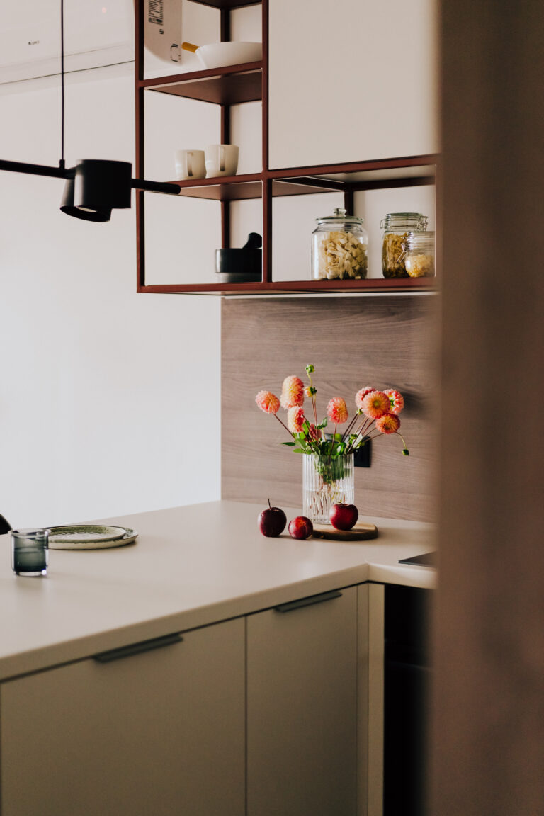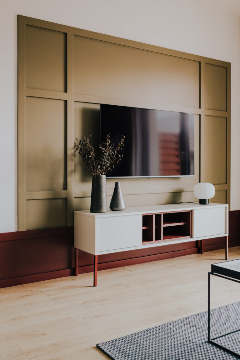 Sercem mieszkania jest kuchnia, która została zaprojektowana w stonowanych beżach z dodatkiem drewna, które są tłem dla stalowych bordowych dodatków. Pokaźnych rozmiarów wyspa została optycznie odciążona dzięki stalowym nóżkom i wieńczącym go regale. Dalsza cześć mieszkania to otwarty salon, gdzie ściana TV została wykończona nowoczesną sztukaterią pomalowaną na kolor butelkowej zieleni, a malowana boazeria w kolorze bordo ciągnie się na wzdłuż całej ściany. Szafka RTV, tak jak pozostałe zabudowy czy meble zostały indywidualnie zaprojektowane z myślą o tym mieszkaniu. Nad tapicerowaną w kolorze szarości sofą znajdują się drewniane półki. Zwiń