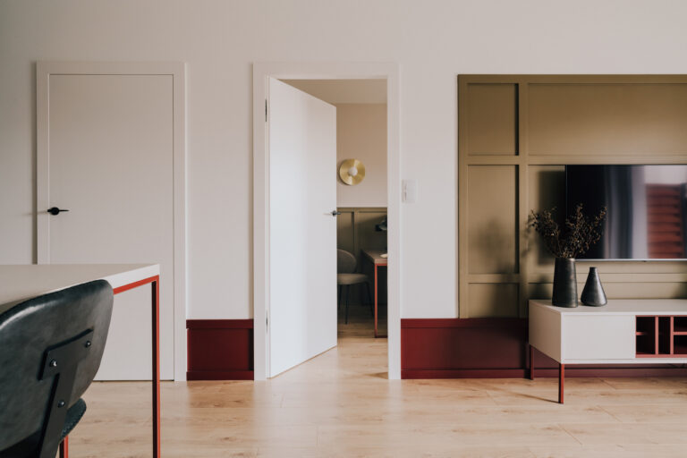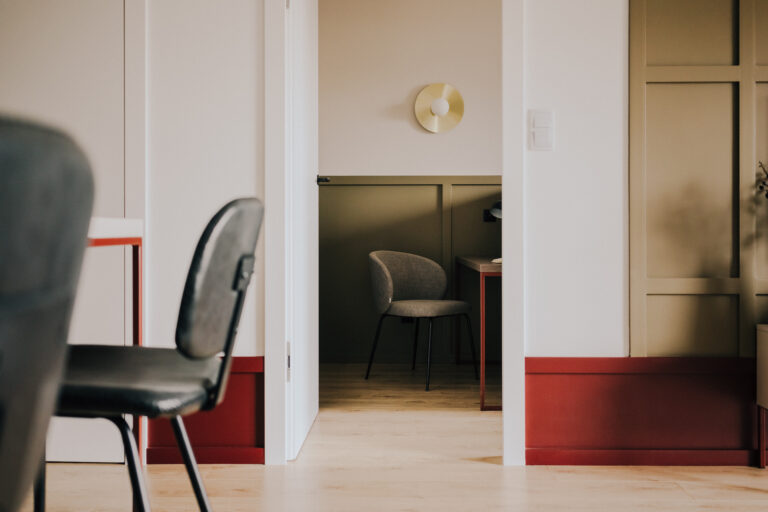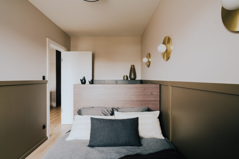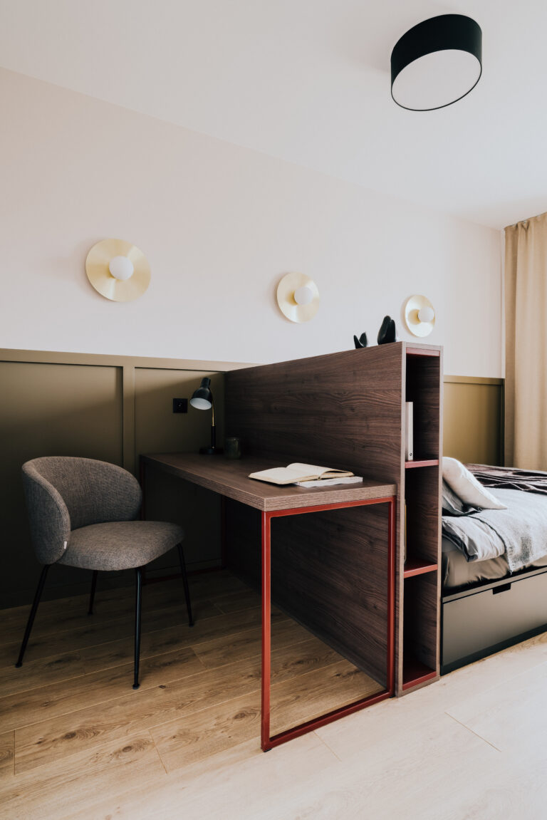 Z salonu możemy bezpośrednio wejść do sypialni, na której ścianach również dominują zielenie, a nieco bardziej dekoracyjnego charakteru dodają trzy kinkiety na mosiężnych talerzach. W niewielkiej sypialni znalazło się również miejsce do pracy, tak ważne we współczesnej erze pracy zdalnej. W mieszkaniu została wydzielona również zamknięta garderoba, co pozwoliło na zrezygnowania z dużych szaf w sypialni i zastąpienie ich jedynie wiszącymi szafkami, które nie przytłoczyły wnętrza.