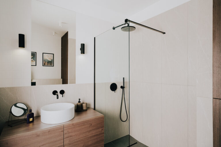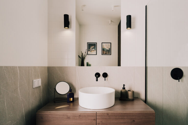 Wiatrołap, którego posadzka została wydzielona grafitową płytką, dodatkowo pomieścił dużą projektowaną zabudowę. Ponadto znajduje się w nim stalowa ławka na tle okrągłego lustra. Całość kompozycji dopełnia wisząca lampa o stożkowym kloszu. Na ścianach łazienki znajduje się połączenie ryflowanej szarej płytki z rysunkiem żyły wraz z graficzną białą, kwadratową mozaiką. Zabudowy zostały zaprojektowane w kolorze ciemnego drewna, które przewija się w całym mieszkaniu, a dobrane baterie stanowią czarny akcent wnętrza. Nad zabudową miski WC znalazło się miejsce dla plakatów, które dodają nieco koloru i balansują całą przestrzeń.